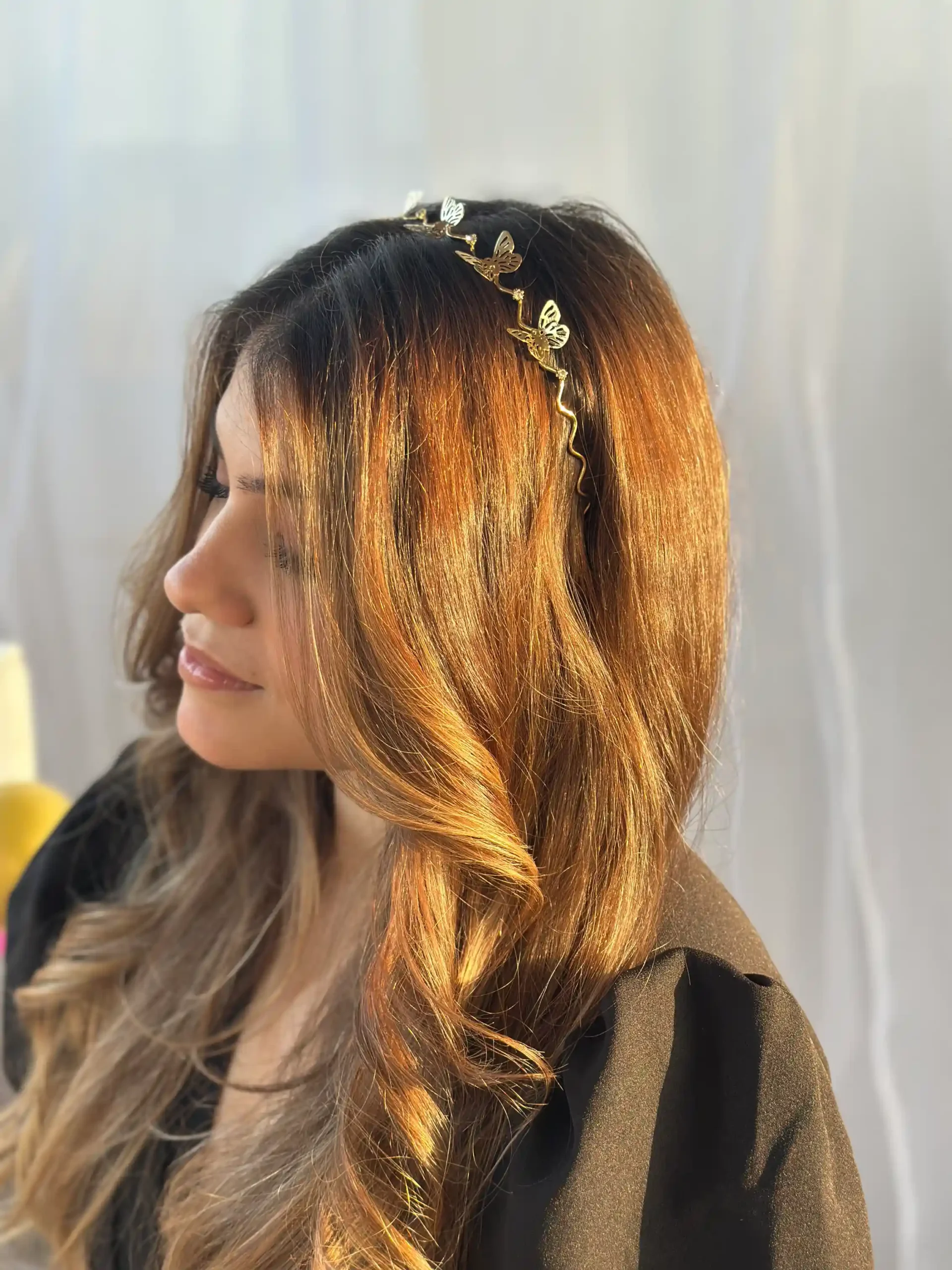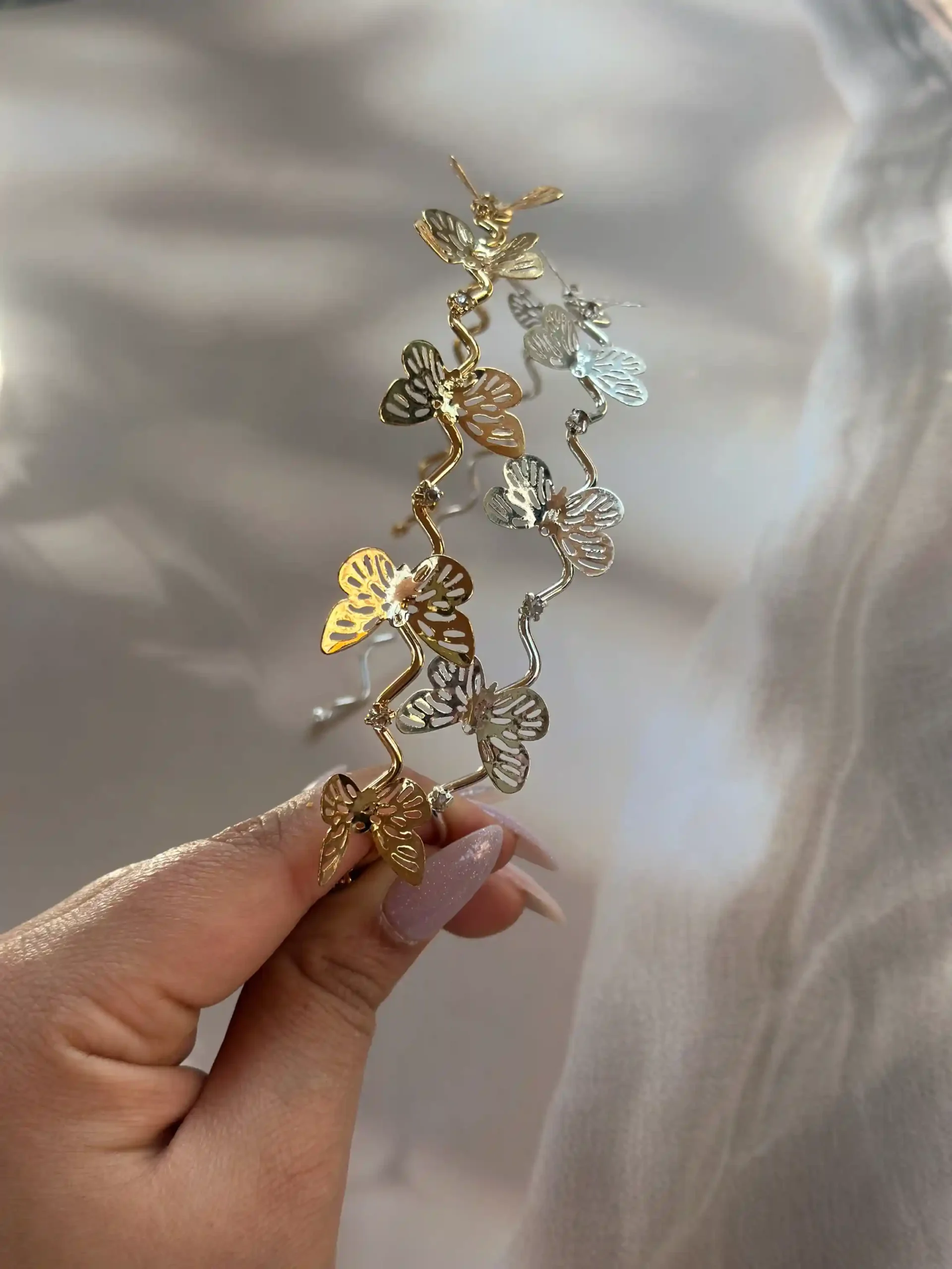 A graceful butterfly vine hair accessory featuring delicate butterfly motifs arranged along a soft, flexible curve. Designed to add a subtle statement, it blends elegance with a whimsical charm?perfect for elevating open hair, half-up styles, or low buns. Lightweight and comfortable, it sits beautifully without feeling heavy.