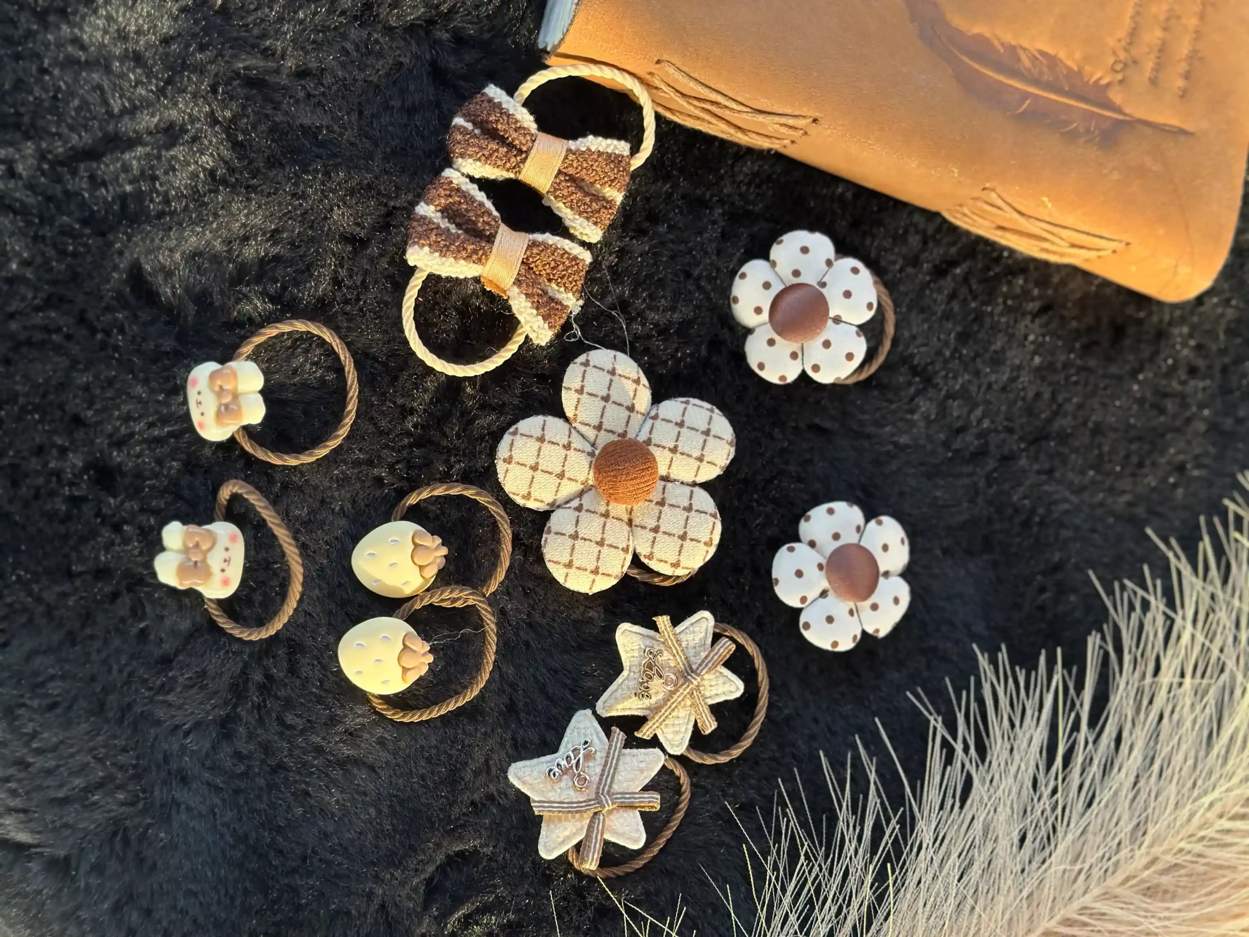 Inspired by warm neutrals and playful details, the Cocoa Meadow Kids Hair Tie Set features an adorable mix of bows, florals, berries, and cute character charms in earthy brown and cream tones. Designed to be gentle on little hair, these elastic bands provide a secure yet comfortable hold for everyday styling.