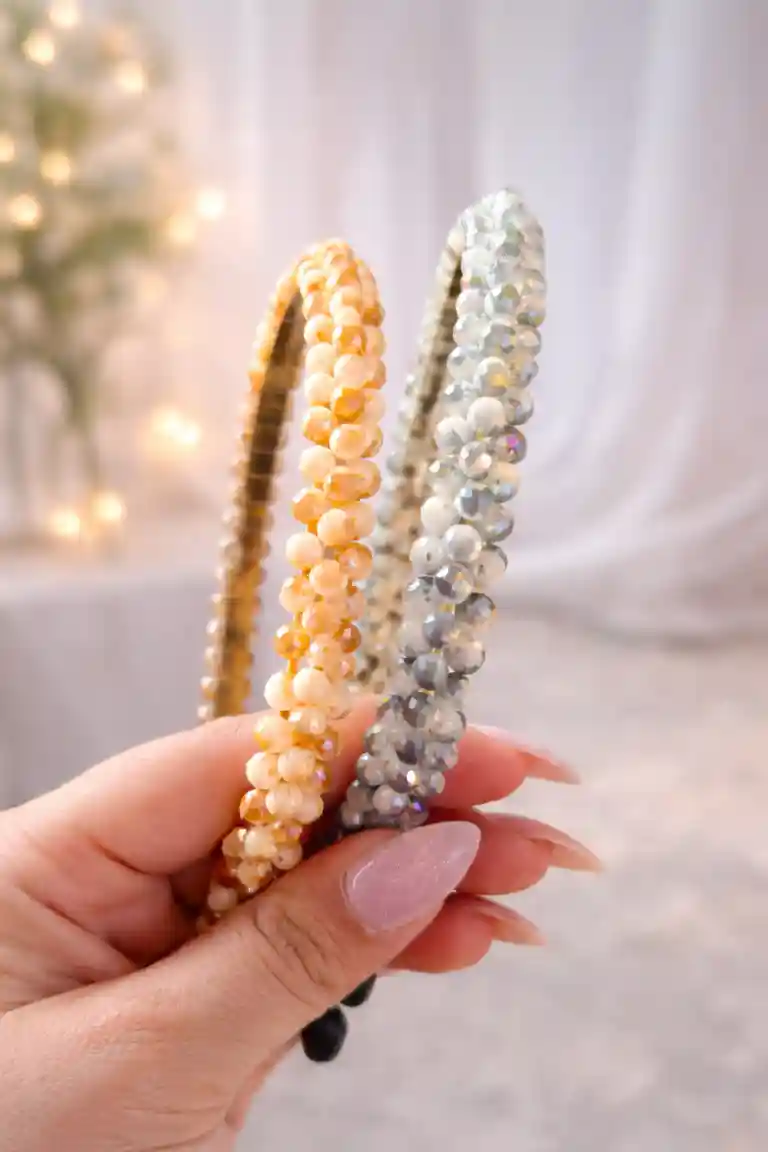 Delicately handcrafted to shimmer in natural light, the Crystal Aura Headband features finely faceted beads arranged on a slim, comfortable base. Designed to catch soft golden highlights, it adds a touch of effortless elegance to both everyday looks and special occasions.