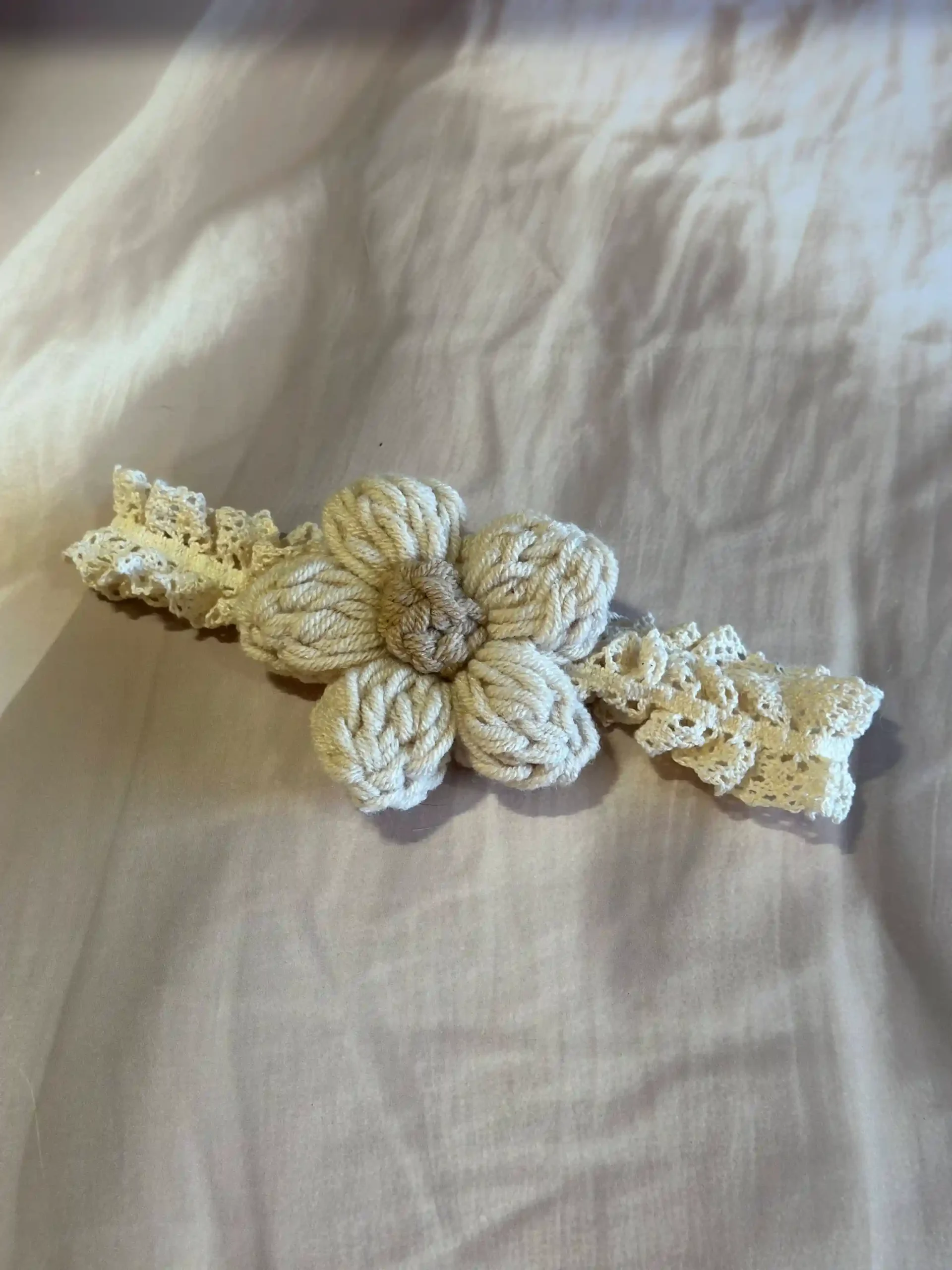 Hand-knit yarn flower with a soft lace elastic band