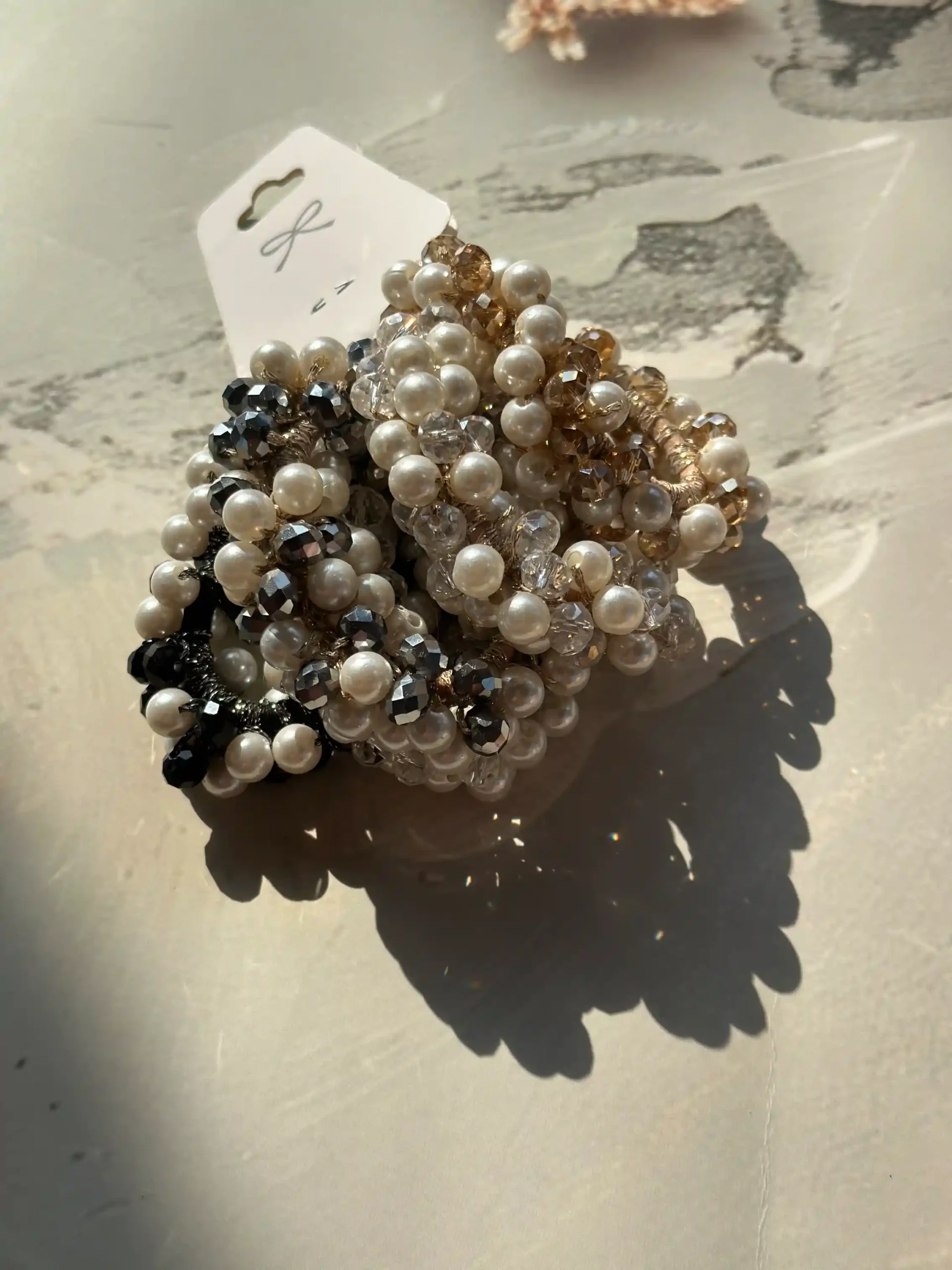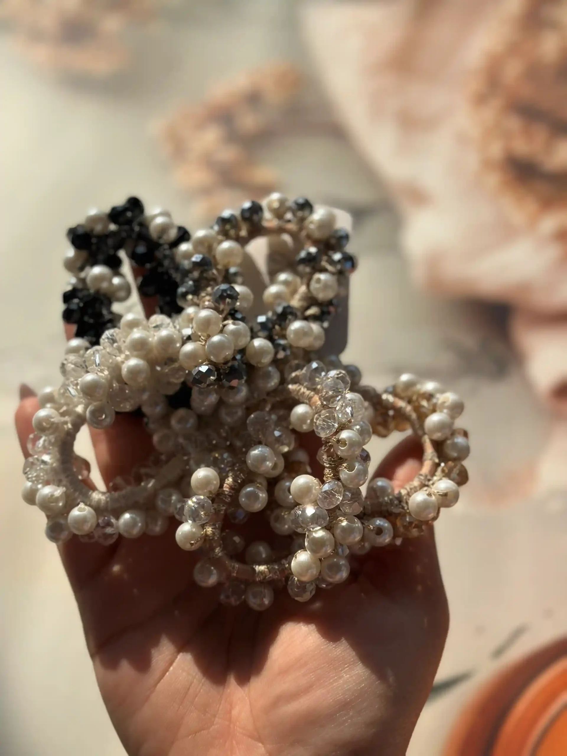 Elevate your everyday hairstyles with the Pearl Luxe Hair Ties ? Set of 5, a refined blend of classic pearls and faceted crystal beads. Designed to add instant elegance, these hair ties double as statement accessories?beautiful both in your hair and worn on the wrist.