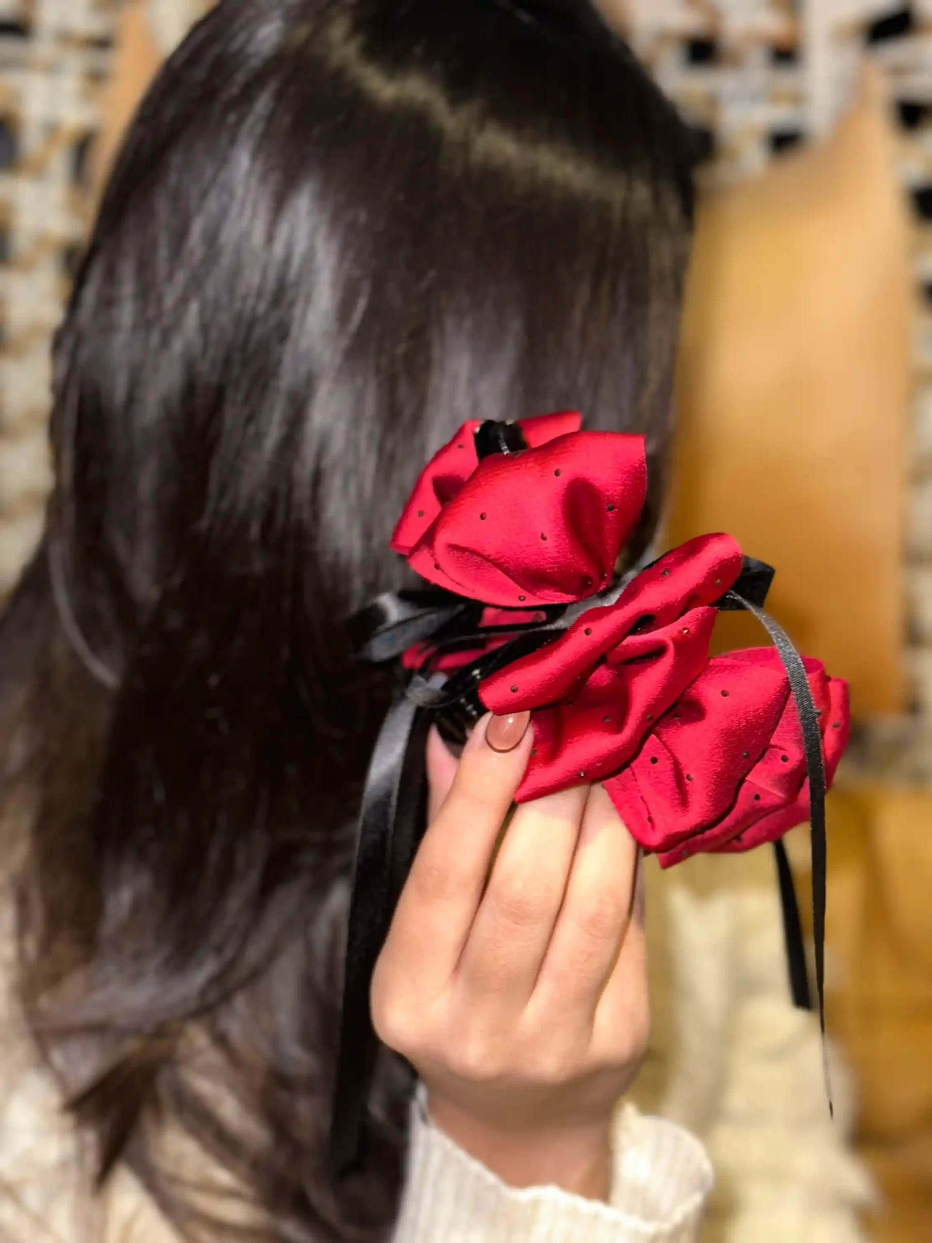 Elegant and statement-worthy, the Ruby Bow Scrunchie Claw features a rich red satin-finish fabric with subtle dotted detailing, finished with soft black ribbon ties. Designed to give volume and structure, this bow-style scrunchie claw adds a bold yet graceful touch to everyday and occasion hairstyles while holding hair comfortably in place.
