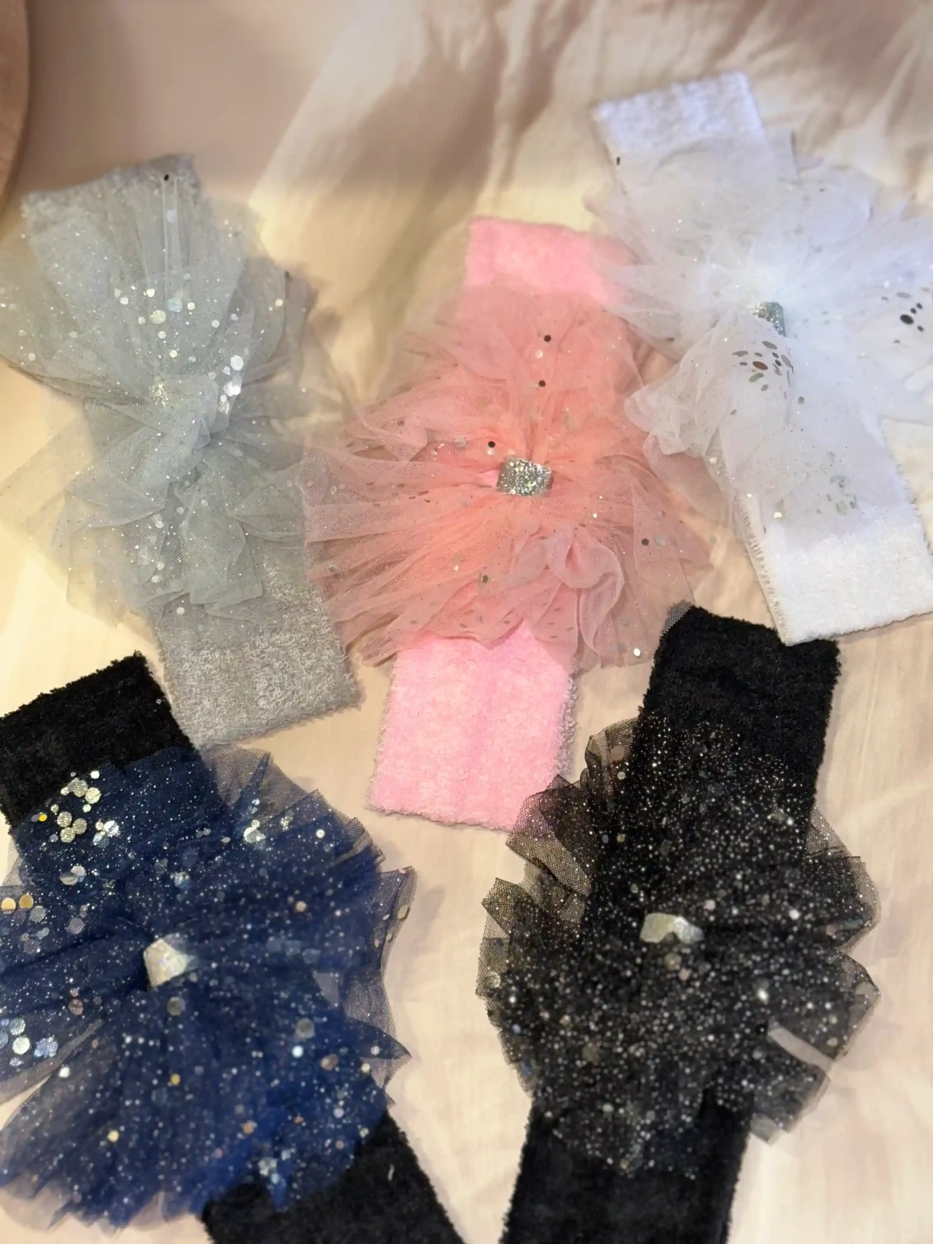 Our Stardust Tulle Baby Bands are crafted with ultra-soft stretch bands and layered tulle bows dusted with subtle shimmer. Designed to feel feather-light on your baby’s head, these bands add a magical touch without compromising on comfort.