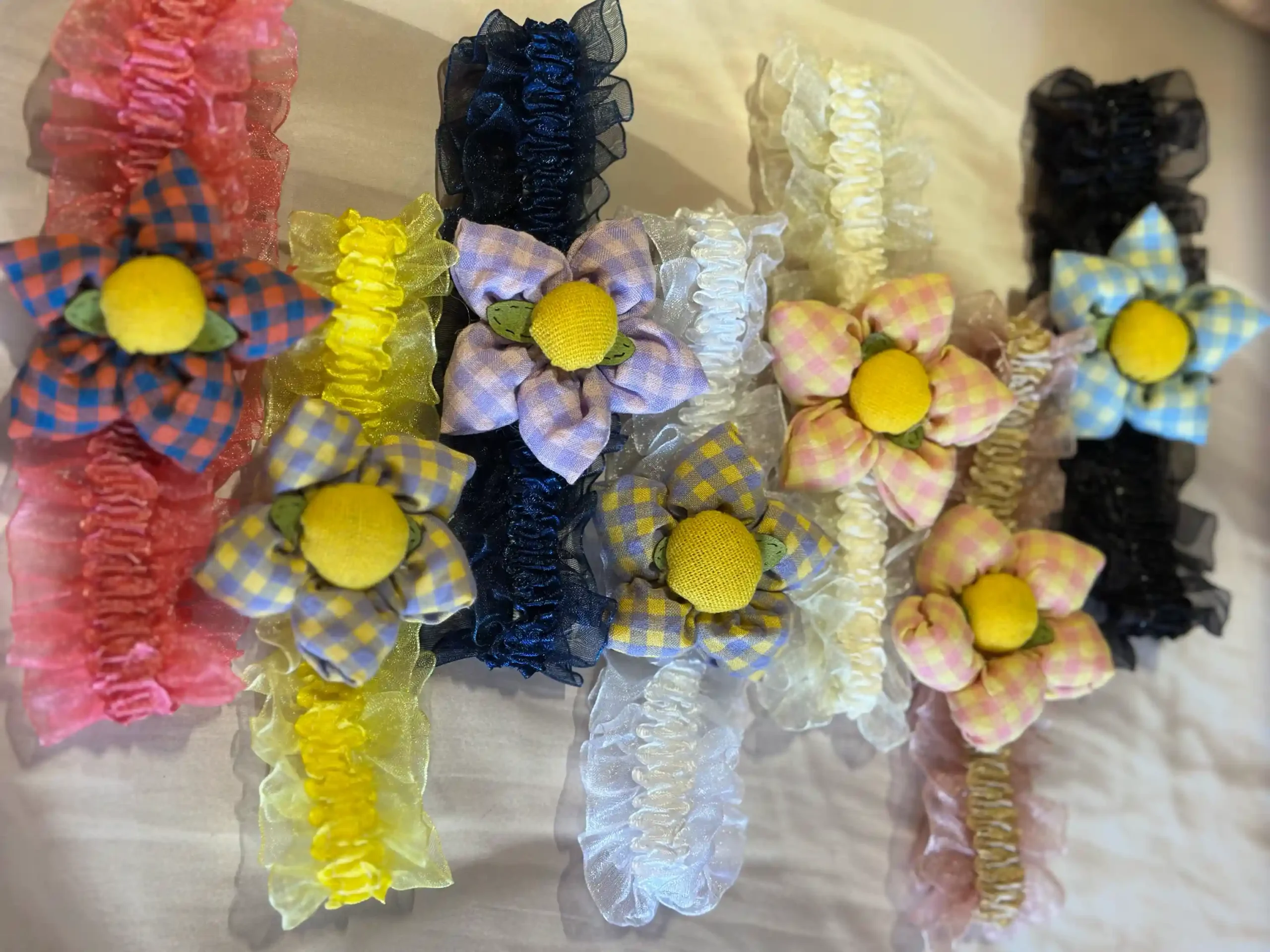 The Sunny Petal Gingham Baby Band features a handcrafted fabric flower with a cheerful yellow centre, paired with delicate organza ruffles for a playful yet premium look. Designed on a super-soft elastic band, it stays gentle on baby’s head while adding a pop of colour and joy.
